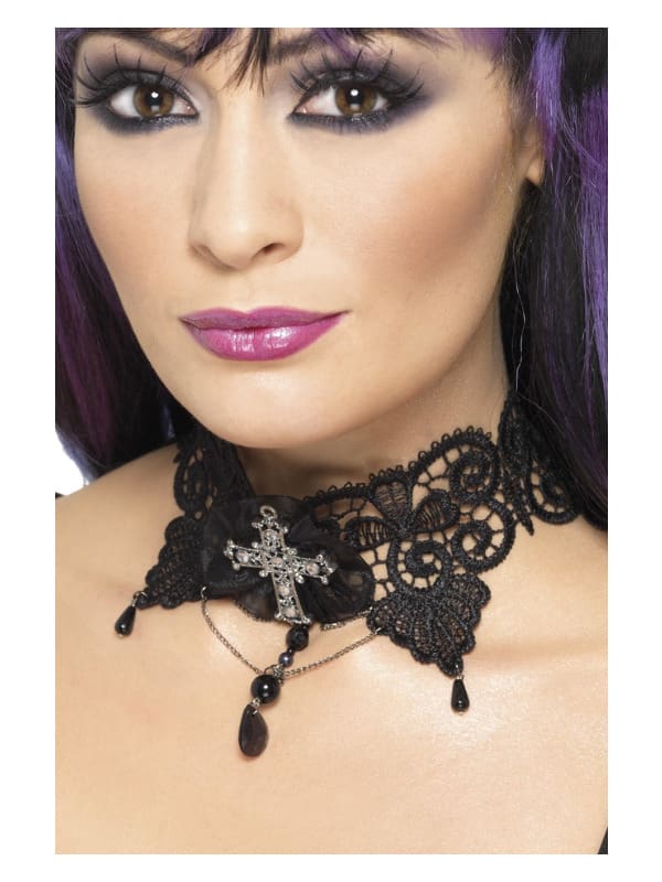 Gothic Lace Choker, Black, Ornate with Jewelled Cross
