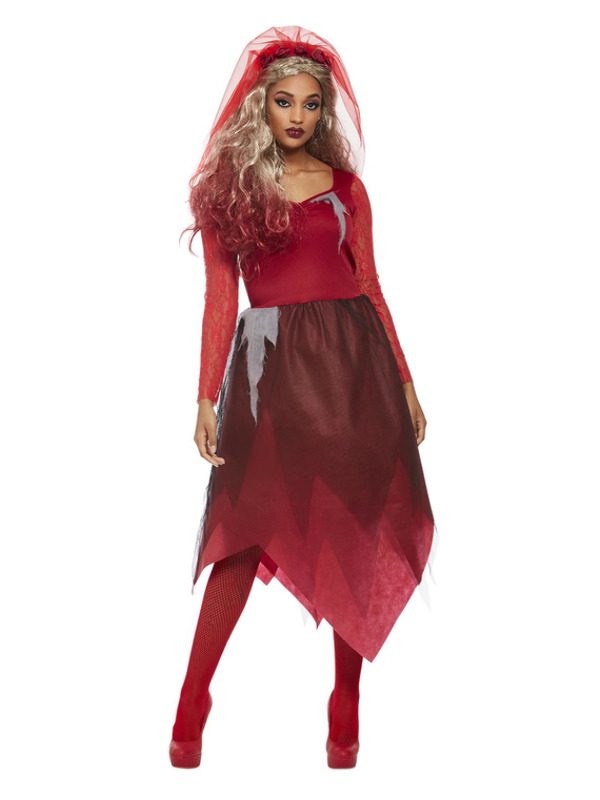 Graveyard Bride Costume, Red, Dress & Veiled Headband