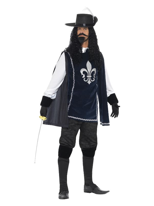 Musketeer Male Costume, with Top, Hat, Navy, Gloves, Boot Covers, Beard & Tash