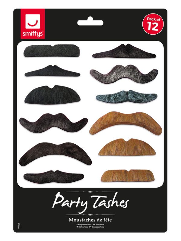 Party Tashes, Assorted Designs & Colours, 12Pk, Self Adhesive